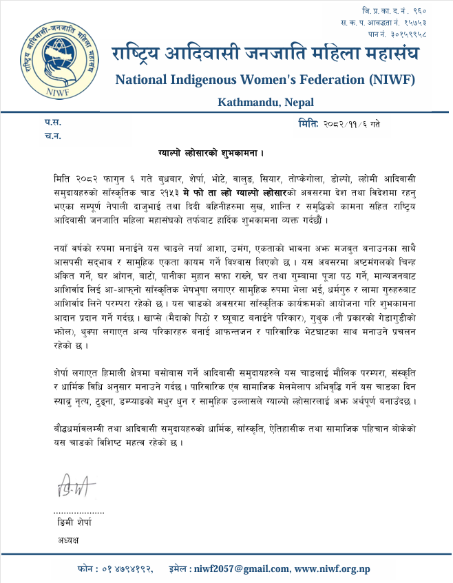 मिति २०८२ माघ ४ गते सोमबार, तामाङ समुदायको राष्ट्रिय एंव साँस्कृतिक पर्व मन्जुश्री संम्वत २८६२ सोनाम ल्होछार ता ल्हो (घोडा वर्ष) को अवसरमा देश तथा विदेशमा रहनु भएका सम्पूर्ण नेपाली दाजुभाई तथा दिदी बहिनीहरुमा सुख, शान्ति र समृद्धिको कामना सहित राष्ट्रिय आदिवासी जनजाति महिला महासंघको तर्फबाट हार्दिक शुभकामना व्यक्त गर्दछौं ।